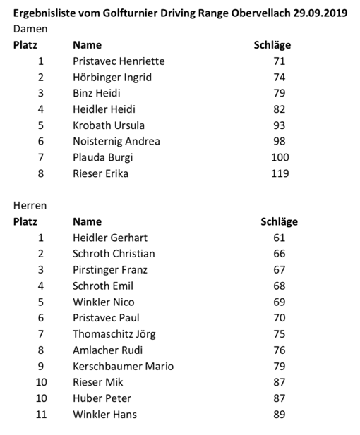 Bei herrlichem Wetter fand auf der Driving Range in Obervellach für diese Saison das letzte Golf-Driving Range Turnier mit einer tollen Beteiligung statt.